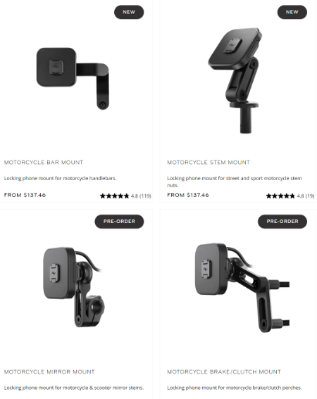 The Peak Design requires you to squeeze clips on the motorcycle/bike mounts to detach the phone, so it will never fall off.
